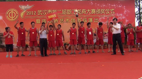 2012年6月22日至6月24日武漢市第二屆職工龍舟賽在武漢東湖聽(tīng)濤景區(qū)舉行。此次龍舟大賽旨在慶??偣?huì)成立90周年、弘揚(yáng)中華民族龍舟歷史文化、豐富全市職工精神文化體育生活,是一場(chǎng)以“弘揚(yáng)中華龍舟文化、展現(xiàn)武漢城市精神”為競(jìng)賽主題的全民大賽。24日,東湖聽(tīng)濤景區(qū)鼓聲陣陣,我市第二屆職工龍舟大賽在激烈的角逐中落下帷幕。江漢大學(xué)海博龍舟隊(duì)和江岸區(qū)總工會(huì)鳴辰集團(tuán)分別以2分8秒和2分49秒獲得了22人制和10人制龍舟的第一名。10人制龍舟賽率先進(jìn)行,江岸區(qū)總工會(huì)鳴辰集團(tuán)一馬當(dāng)先,保持絕對(duì)優(yōu)勢(shì),江漢區(qū)宏興代表隊(duì)、東湖風(fēng)景區(qū)地方稅務(wù)局位于二、三名。