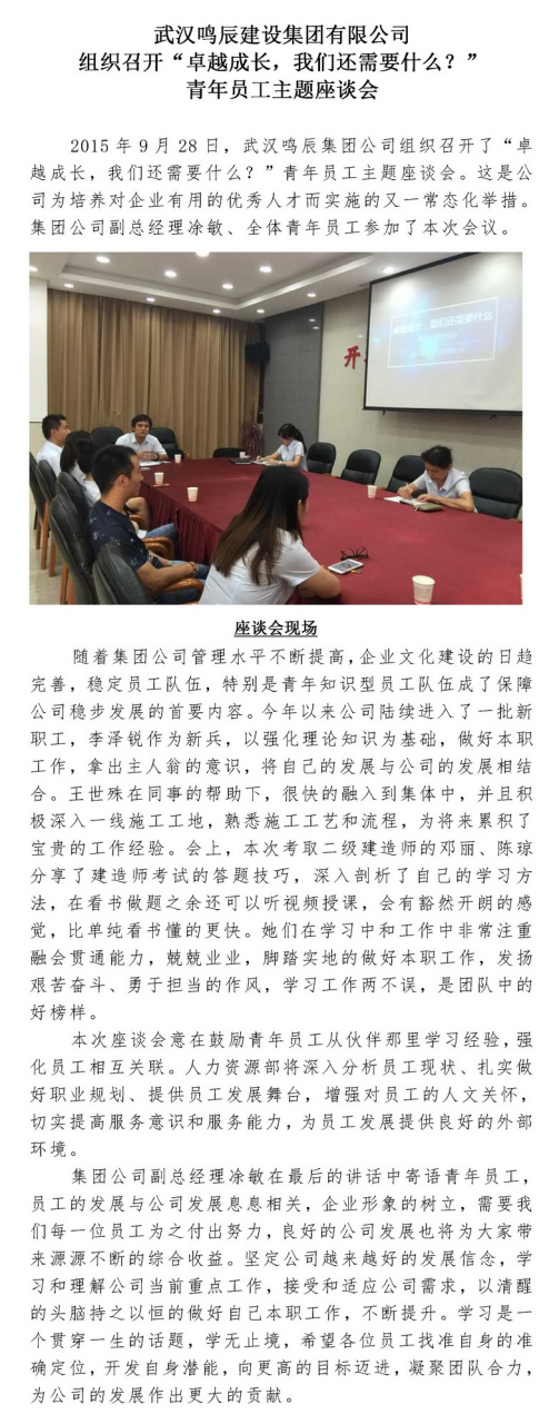 武漢鳴辰建設(shè)集團有限公司組織召開“卓越成長,我們還需要什么?”青年員工主題座談會