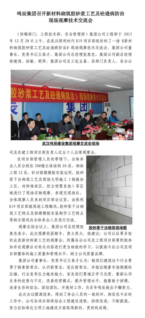 鳴辰集團召開新材料砌筑膠砂漿工藝及砼通病防治觀摩會