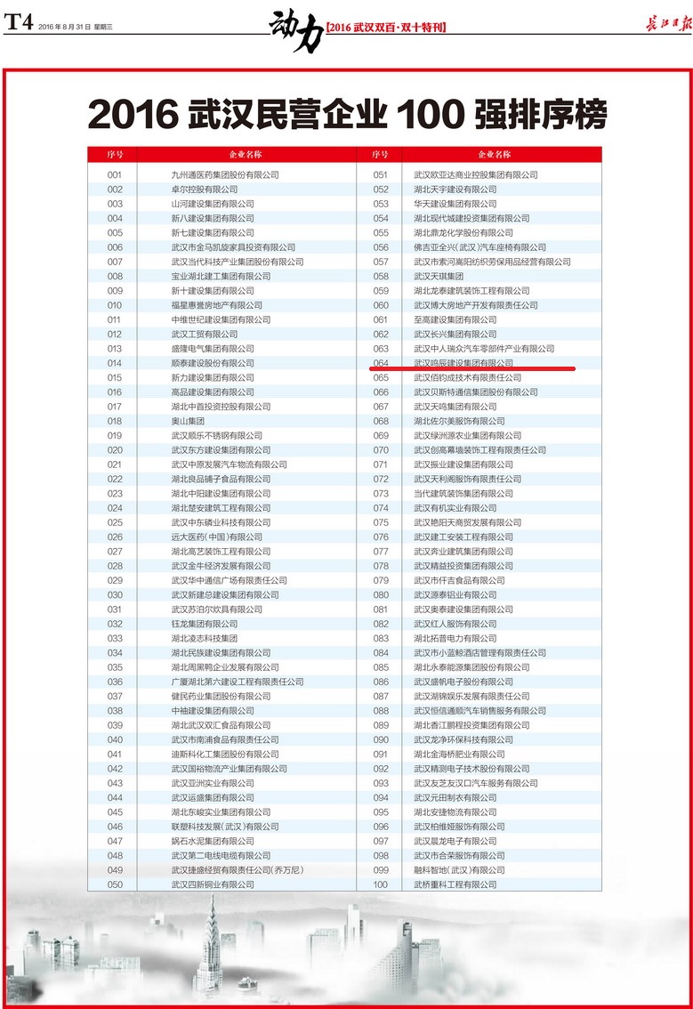 武漢鳴辰建設(shè)集團(tuán)有限公司在“2016年武漢雙百?gòu)?qiáng)企業(yè)評(píng)比”中榮獲“武漢民營(yíng)企業(yè)100強(qiáng)”稱號(hào),相關(guān)新聞:http://cjrb.cjn.cn/images/2016-08/31/20/2016083120_pdf.pdf