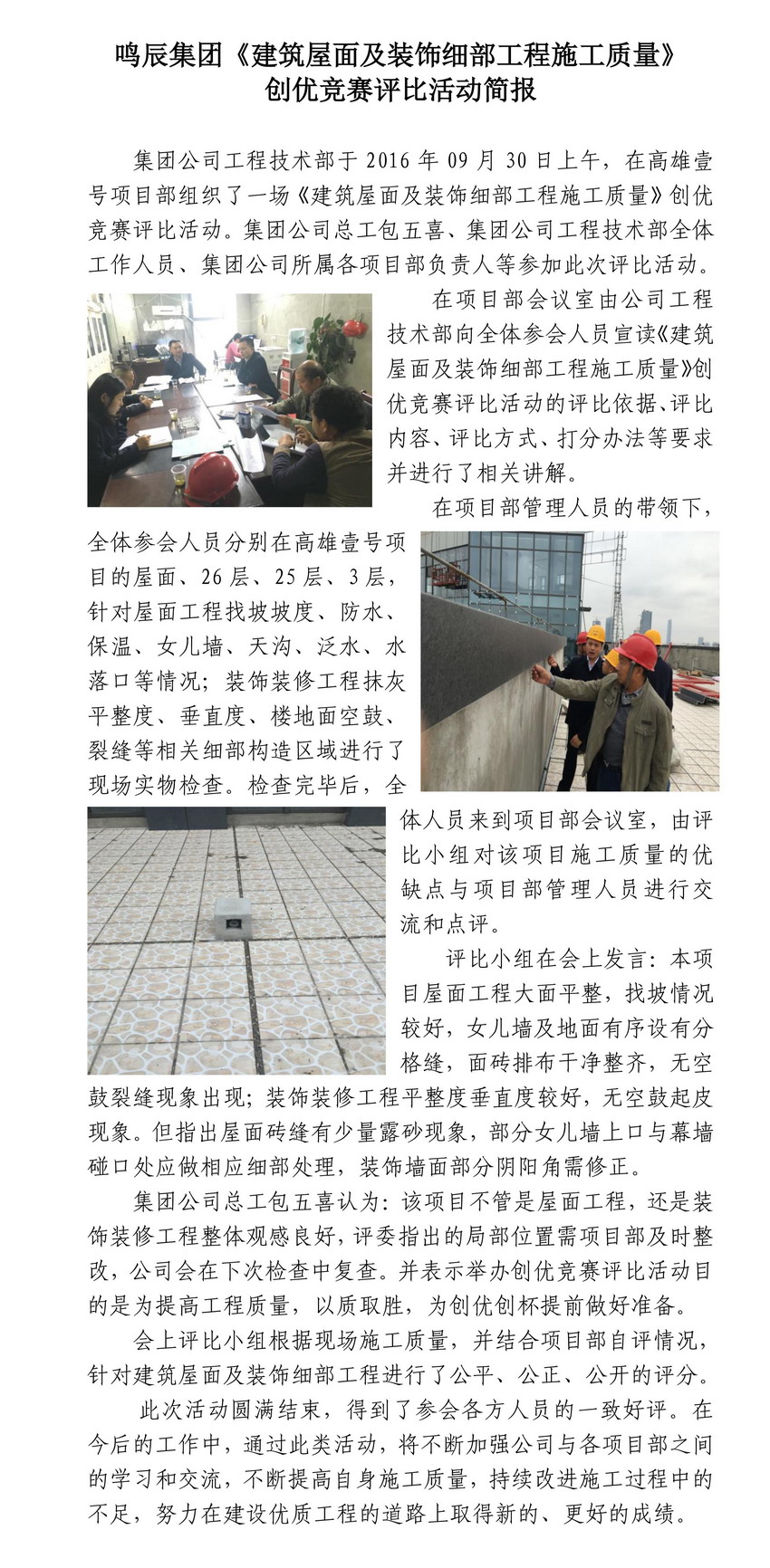 鳴辰集團《建筑屋面及裝飾細部工程施工質(zhì)量》創(chuàng)優(yōu)競賽評比活動簡報