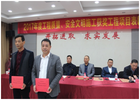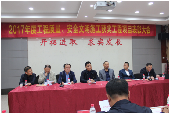 集團(tuán)公司副總經(jīng)理胡萍同志宣講了《關(guān)于表彰2017年度獲獎(jiǎng)工程項(xiàng)目的決定》決定對集團(tuán)公司2017年度榮獲的7個(gè)工程質(zhì)量及5個(gè)安全文明施工工程項(xiàng)目進(jìn)行了表彰,并由武漢市建筑業(yè)協(xié)會副會長兼秘書長李淼磊、中杰投資公司董事長池建國、勞動(dòng)街辦事處黃主任及鳴辰集團(tuán)公司董事長王春才為保利時(shí)代K18地塊A、B棟及地下室工程、高雄壹號工程、幸福灣二期工程、保利清能西海岸北區(qū)五期工程、祥運(yùn)鞋業(yè)生產(chǎn)車間工程等受表彰的項(xiàng)目進(jìn)行了頒獎(jiǎng)。