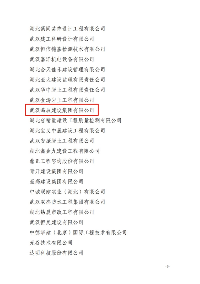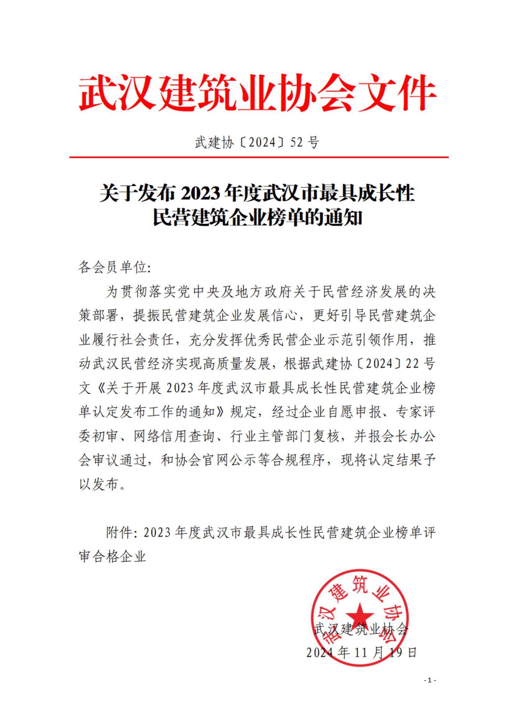 近日,武漢建筑業(yè)協(xié)會發(fā)布武建協(xié)〔2024〕52號文《關(guān)于發(fā)布2023年度武漢市最具成長性民營建筑企業(yè)榜單的通知》?!锻ㄖ分薪視?,武漢鳴辰建設(shè)集團有限公司榮獲2023年度武漢市最具成長性民營建筑企業(yè)。